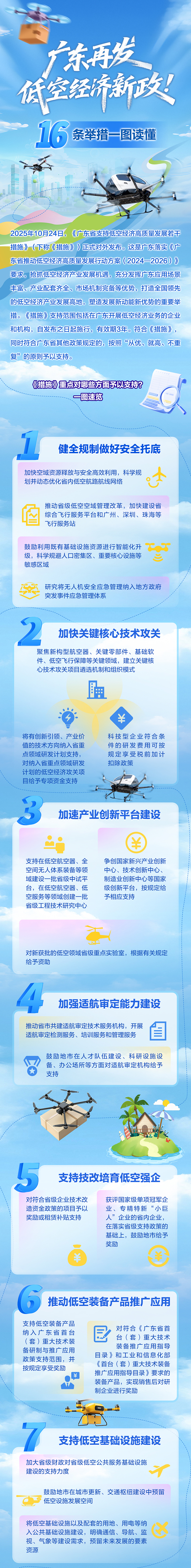 为落实《广东省推动低层经济高质量发展行动计划(2024-2026年)》要求,10月24日,《广东省支持低层经济高质量发展若干意见》(以下简称《意见》)正式发布。 《建议》包括16项配套措施,涵盖低空安全、研发、适航审定、基础设施、应用场景等方面。为广东打造引领低层经济产业发展高地,创造发展新动能、新优势。 《建议》的支持范围包括在广东省开展低收入经济企业的企事业单位。本办法自发布之日起施行,有效期3年。对符合《办法》及广东省其他规章制度的,将按照规定给予支持舞蹈以“最优、优质、不重复”为原则。 《建议》提出,加快基础技术研究,聚焦新飞机构型、关键零部件、关键软件、低空飞行保障等重点领域,建立低空领域重大关键技术攻关项目遴选机制和组织模式,将具有创新引领性和产业价值的技术方向纳入省级研发计划支持的重点领域。对于备受各界关注的低层基础设施建设,《办法》提出,加大省级财政对省级基础设施建设和综合交通运输体系建设的支持力度,鼓励地市将低层基础设施和土地支持等基础设施建设融为一体,为未来发展储备宝贵资源。除了恩库针对低空文化旅游、空中交通等场景的肆虐,《办法》还建议,进一步整合资源,共建共享应急飞机驻防、搬迁救援基地和临时起降点网络,建设适应各类灾害和重大突发事件的航空应急救援基础设施体系,发展乡镇起降点。南方网、广东考察记者 刘思敏 何静文 设计:刘小雷 陈丽云